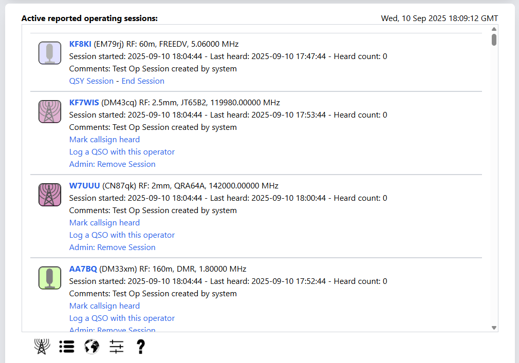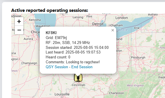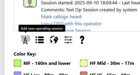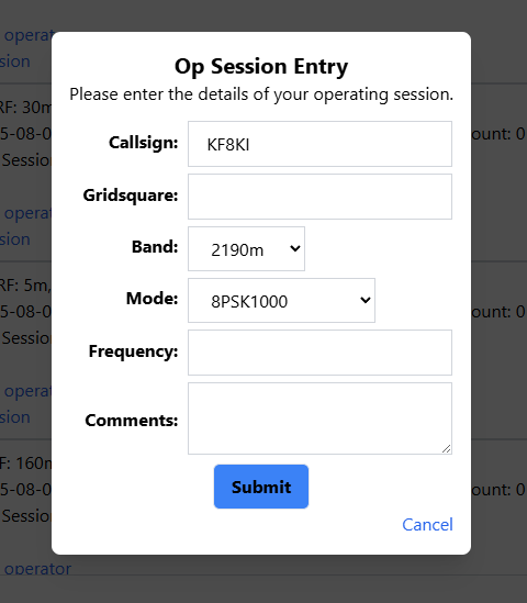 The QSY session link provides the means to edit your operating session and change any parameter except the callsign for the operating session. The operating session management form shown in the Setting Up an Op Session section will open and any necessary changes may be made. Updating your operating session in this fashion will reset the expiration timer and "refresh" the operating session indication.