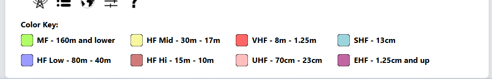 Each operating session has a specified band. For simplicity, the available Amateur Radio bands are divided up into groups and assigned a color as seen in this color key: