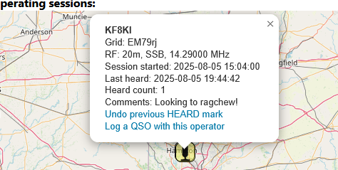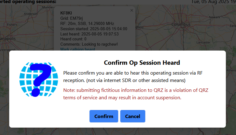 To prevent abuse, a user may mark another operator's session as "heard" once. When you mark a session heard, you will be asked to confirm that this is actually a direct RF reception of the transmission: