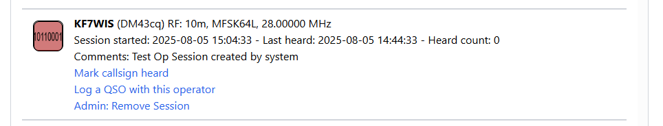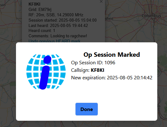 Once a session has been marked "heard" it will reset the expiration timer and "refresh" the operating session indication. The operating session's "heard count" is also updated. A confirmation is provided: