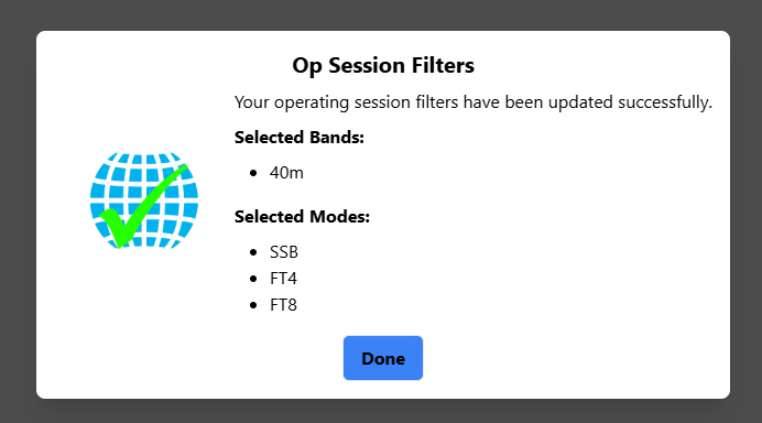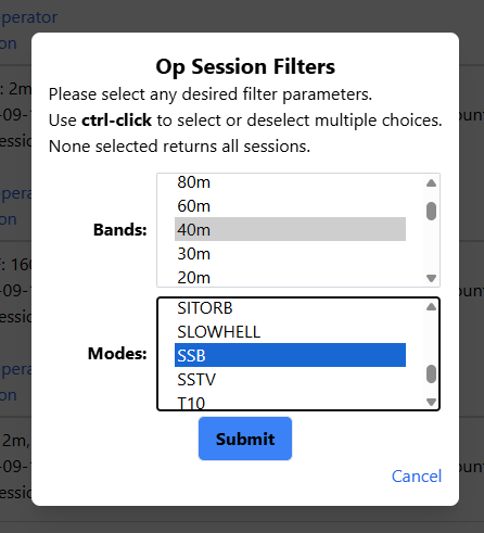 This will open the filters control panel. Scroll through the available bands and modes and select which bands and modes you wish to display op sessions for. Holding the control key while clicking selections allows a choice to be selected or deselected and for multiple selections to occur. No choices selected clears all filters and returns all bands or all modes as applicable.