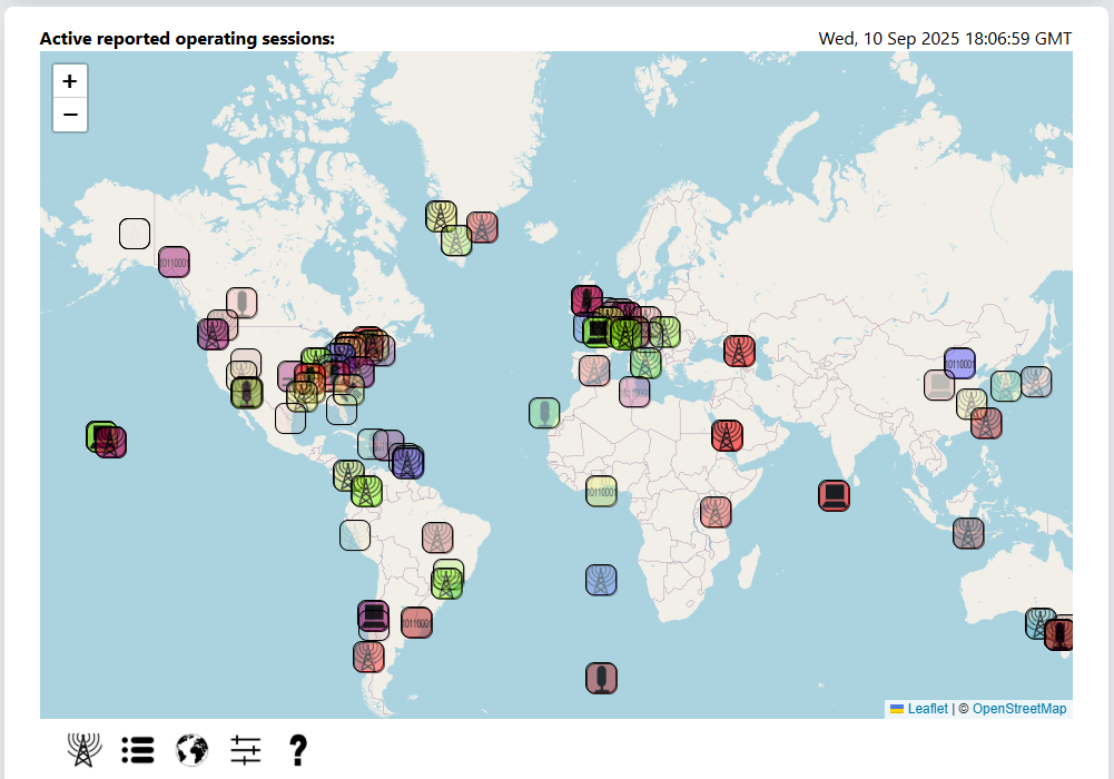 The Real Time QSO Manager introduces the concept of an "operating session". Each operating session has been added by an active user, and RTQM provides a scrollable and zoomable world map showing a marker for each active operating session. An example: