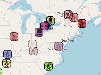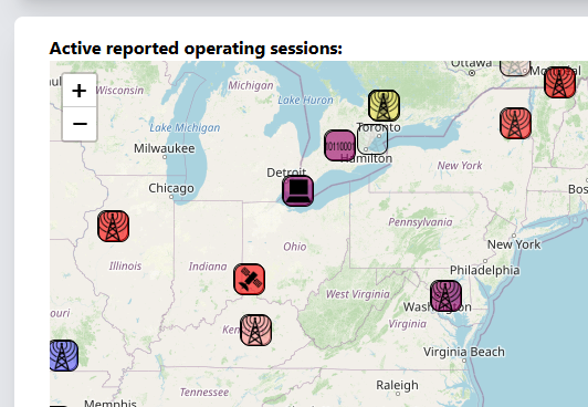 The Real Time QSO Manager is designed around the concept of "fresh" data. One of the ways the age of the op session information is conveyed is in the form of the opacity of the op session marker. Each marker is surrounded by a black border so it's obvious where markers are, even as they fade. As the op session information ages and approaches expiration, the op session marker fades until it has expired completely. This behavior is visible in both the map and list views.