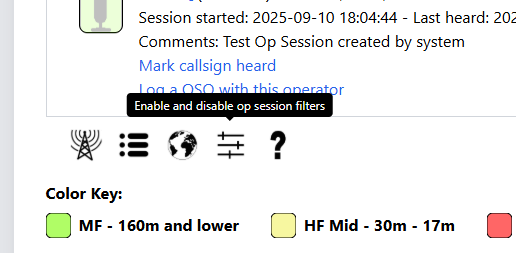 The Real Time QSO Manager provides the ability to select filters so as to reduce the number of operating sessions shown on the map or list views and ease the identification of sessions an operator may wish to work. To enable or disable operating session filters, select the filter control button on the tool bar below the map or op session list:
