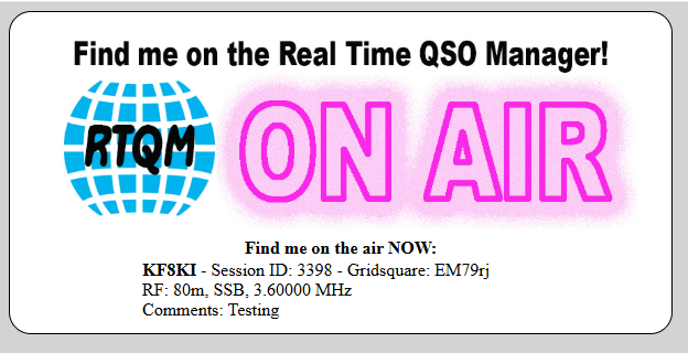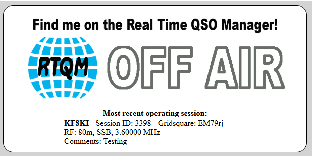 The Real Time QSO Manager provides a widget which may be embedded in your QRZ bio or any other web page in order to advertise your operating sessions to the world. A simple iframe needs to be embedded where you wish the widget to appear. Once included, each time the parent page is loaded, the RTQM database is queried for your latest operating session and the details are shown, including if you are currently on or off the air. When you have an active operating session, the widget will appear as: